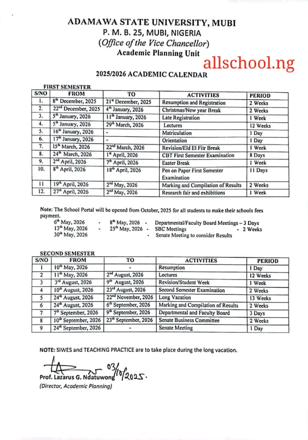 The Adamawa State University (ADSU) Academic Calendar covers the schedule from 8th December, 2025 to 24th September, 2026, making it a complete eight months, two weeks and four days for the academic session. Students are expected to have a copy of this timetable, marking out the key dates and their activities.
